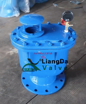 復合式排氣閥,閥體為圓桶狀,閥門內件包括不銹鋼浮球,杠桿及閥瓣,本閥安裝在泵出口處或送配水管線中,用來排除集壓在管中的空氣,以提高管線及水泵的使用效率。當管內一旦出現負壓時,此閥能迅速吸入外界空氣,以保管線因負壓所產生損壞。